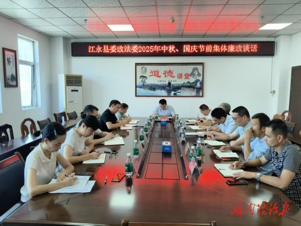 为落实全面从严治党要求,践行中央八项规定精神,筑牢干部职工廉洁自律思想防线,近日,中共江永县委常委、政法委书记文斌与县委政法委班子成员、中层以上干部开展2025年国庆中秋节前集体廉政提醒谈话。