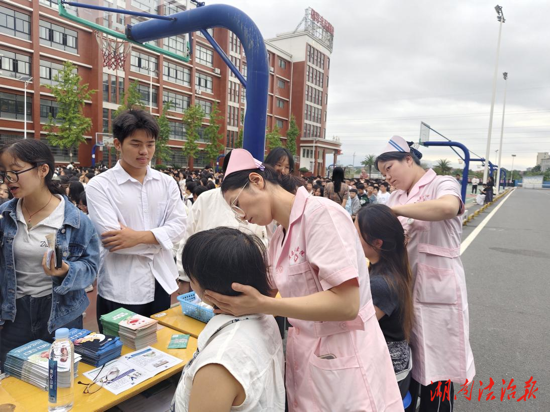除了精彩的讲座与互动,道县中医医院还为师生们带来了“零距离”的健康服务。医院精心准备了助眠安神香囊和《三减三健与健康生活知识问答》手册,免费发放给现场师生,将健康关怀落到实处。同时,医院组织睡眠心理门诊、眼科门诊、中医护理康复门诊等科室的专家及业务骨干,在现场设立咨询台,为师生及家长提供免费健康咨询。针对教师群体普遍存在的颈椎不适、睡眠质量差等亚健康问题,中医护理康复门诊的护理人员运用耳穴压豆疗法进行现场调理,手把手指导教师通过中医适宜技术缓解不适;眼科专家则为师生们进行视力检查,详细询问用眼习惯,提供科学用眼建议,助力预防近视等眼部问题。