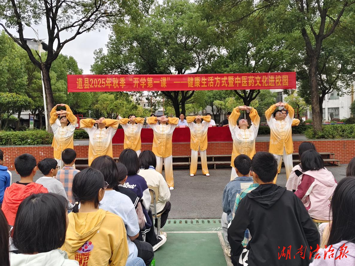 活动以道县中医医院医务人员表演的八段锦拉开帷幕。轻柔舒缓的动作、行云流水的招式,将传统养生功法的魅力展现得淋漓尽致,引得现场师生纷纷驻足观看,不少学生还跟着模仿学习。