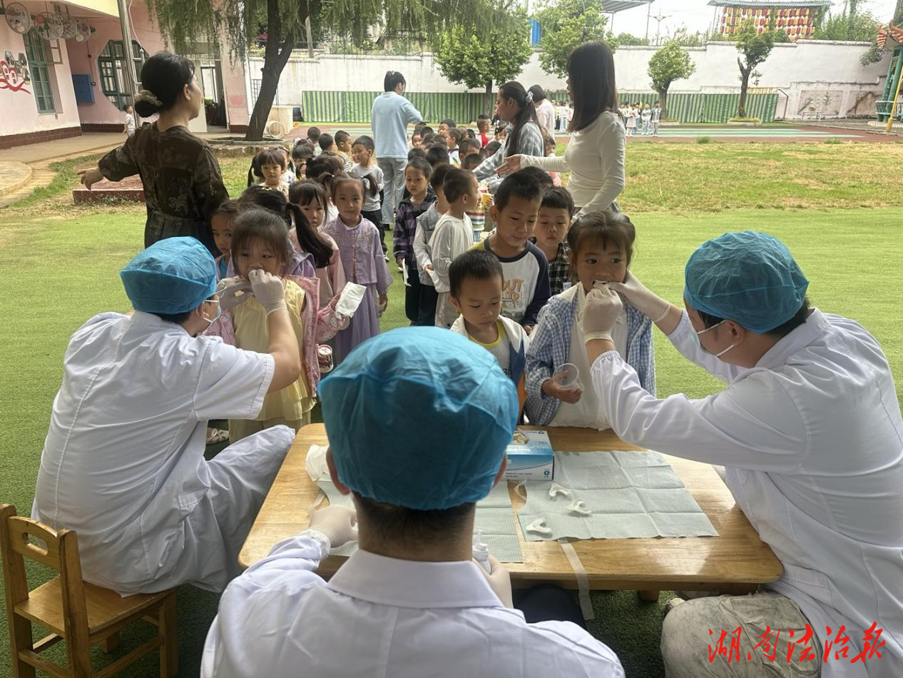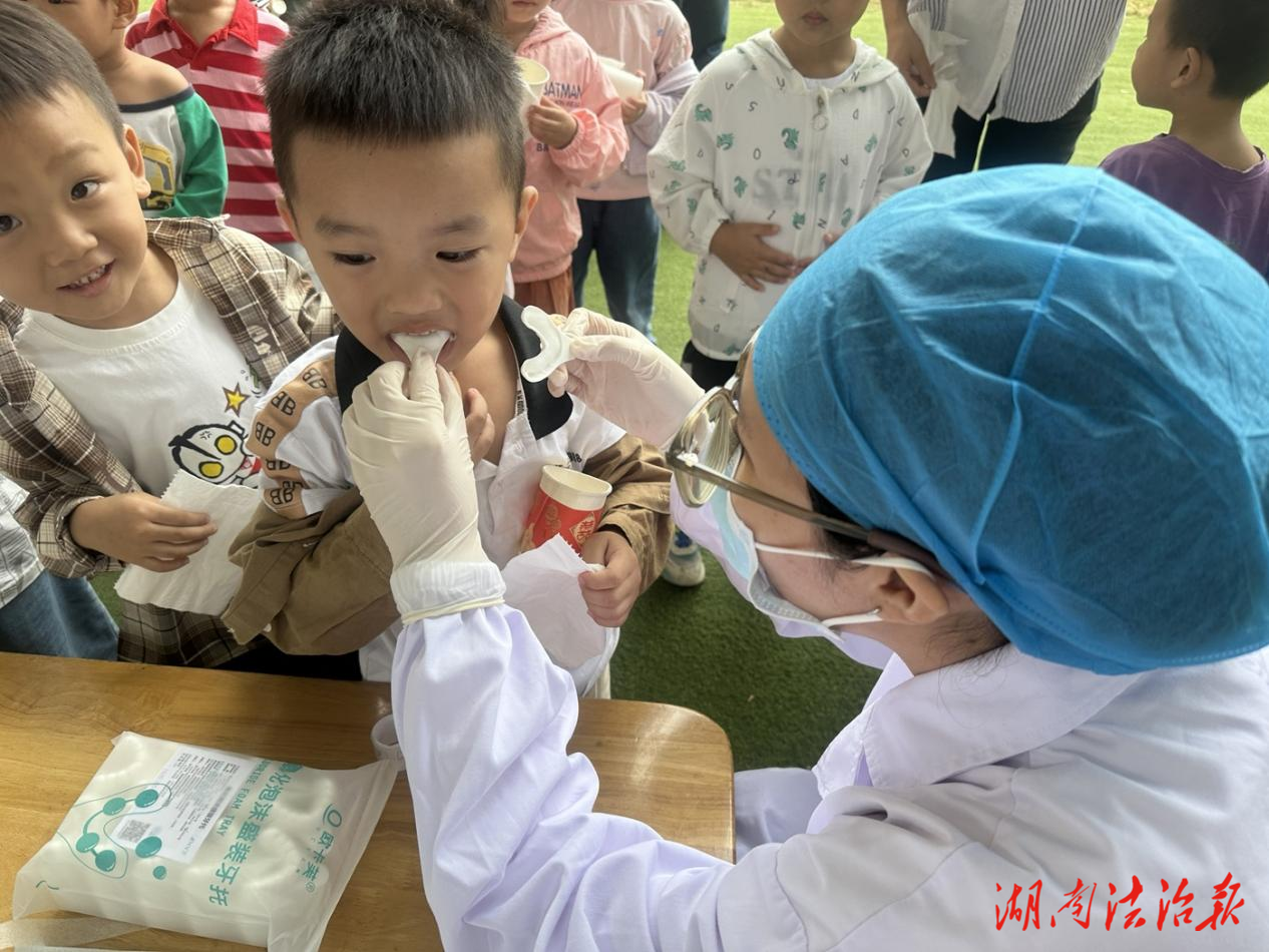 湖南法治报讯(通讯员 李昌春 蒋燕飞)在第37个“全国爱牙日”来临之际,为提升学龄前儿童口腔健康水平,推动“三减三健”行动落地见效,9月23日,道县卫健局组织道县人民医院口腔科医护团队走进城南幼儿园,开展口腔健康宣传暨义诊活动,为园内的270余名3-6岁学龄前儿童进行局部涂氟和专业口腔检查,用实际行动为孩子们的口腔健康筑起坚固防线。