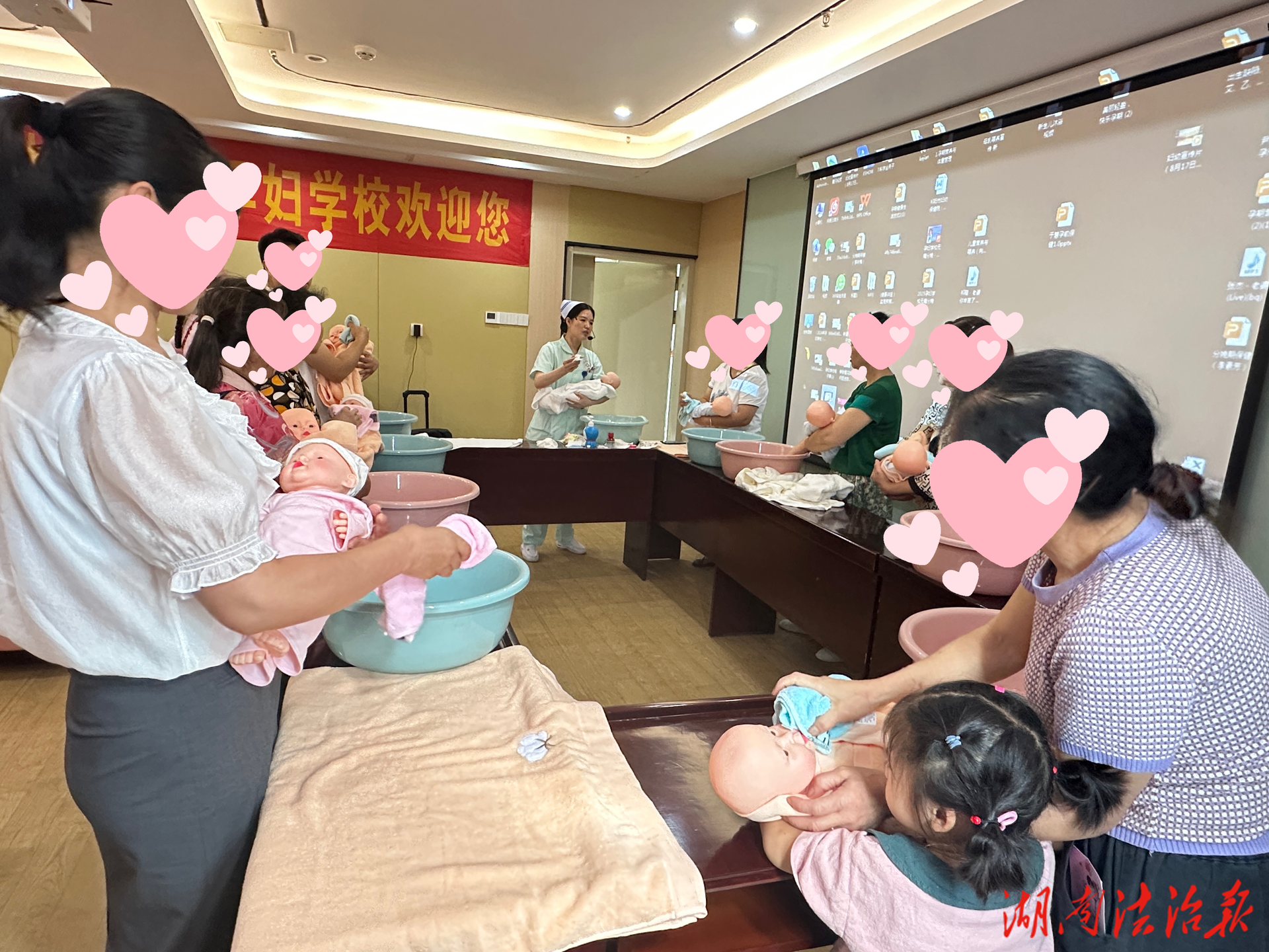 作为活动的主阵地,祁阳市妇幼保健院的“孕妇学校”更是热闹非凡。本期举办的新生儿沐浴、抚触等安全护理实操课程吸引了众多准爸妈和新手家长。临床经验丰富的专家们通过模型娃娃,一步步演示并指导孕妇及家属练习如何正确地怀抱娇嫩的宝宝、为新生儿进行安全的沐浴及科学的抚触。