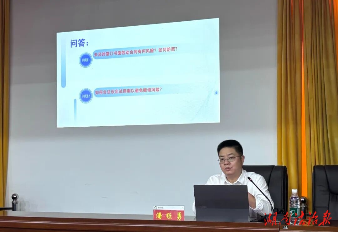 湖南法治报讯(通讯员 彭师琦)9月30日,湖南滳招律师事务所党支部书记、合伙人潘经勇,应法律顾问单位岳阳市公共交通集团有限责任公司邀请,为该集团管理人员、中层干部及各分公司负责人等百余人,开展了题为“新劳动法司法解释下企业用工风险防范与合规管理”的专题培训。