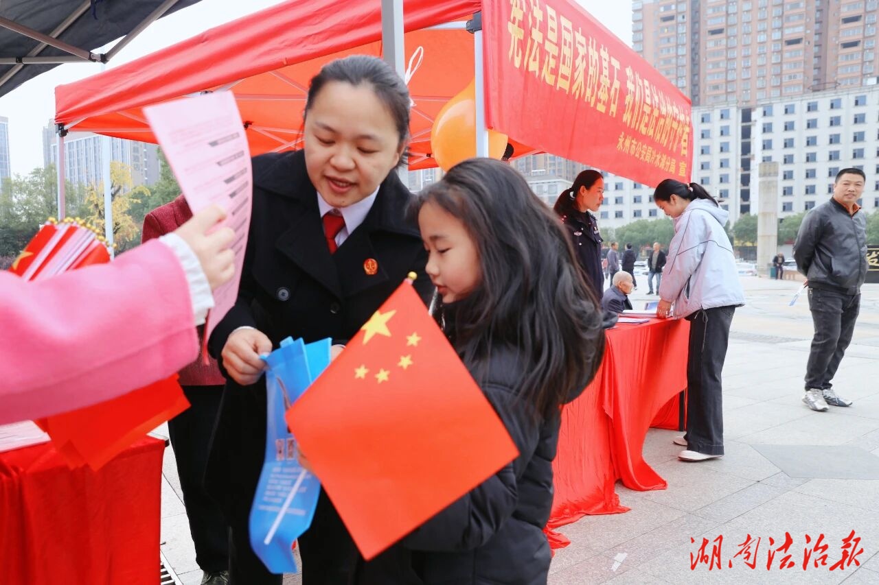 湖南法治报讯(通讯员 唐嫱)在第十二个“国家宪法日”当日,冷水滩区人民法院第八党支部组织党员干警在区政府广场开展“国家宪法日”主题普法宣传活动,让宪法精神顺着党建“红线”传递到群众心间。