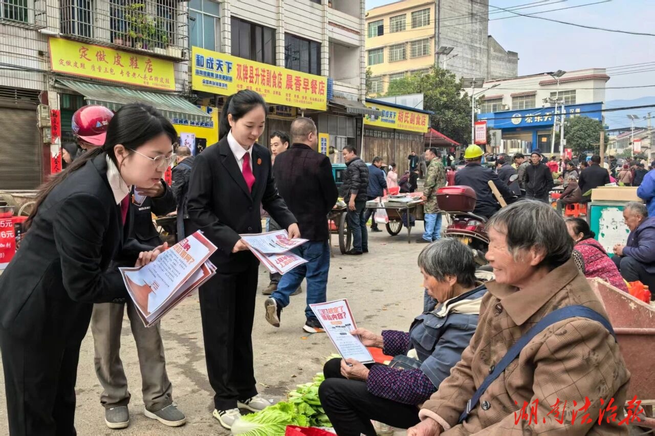 在全国第八个“宪法宣传周”暨第十二个“国家宪法日”之际,为深入学习宣传习近平法治思想,大力加强宪法宣传,12月2日,双牌县人民法院的青年干警们带着宪法读本、宣传资料,来到双牌县五里牌镇农贸市场前,将法律知识送到集市摊头。