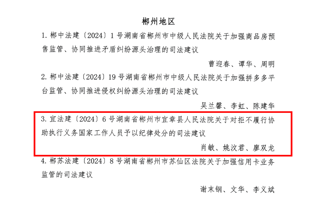 近日,湖南省高级人民法院印发《关于全省法院2024年度“优秀司法建议”评选情况的通报》。其中,宜章法院党组副书记、分管日常工作的副院长肖敏与干警姚汶君、廖双龙编写的宜法建(2024)6号关于对拒不履行协助执行义务国家工作人员予以纪律处分的司法建议获评优秀司法建议。