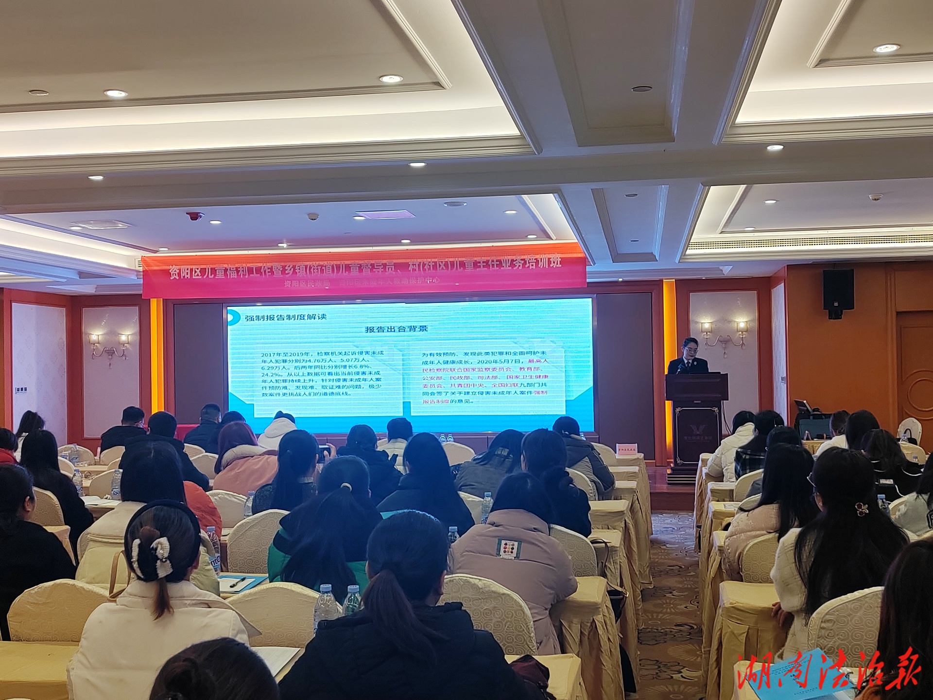 湖南法治报讯(通讯员 薛桃安)2025年12月22日,区人民检察院检委会专职委员刘球红带队,携未检专干薛桃安等一行在全区儿童福利和未成年人保护工作培训班上,以“强制报告制度在儿童保护中的实践与操作”为主题,为全区150余名儿童督导员、儿童主任及相关工作人员带来一场干货满满的法治分享,让强制报告制度真正走进一线、落地生根。