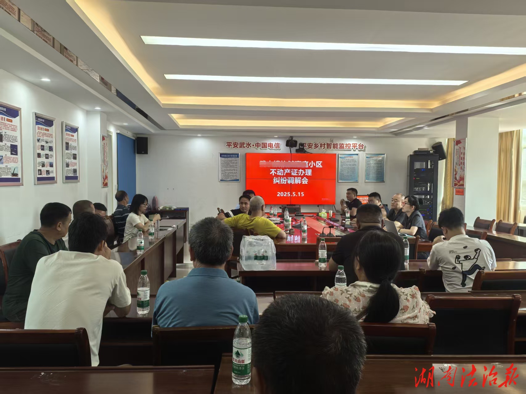 (临武县人民法院创新运用“示范诉讼引领+先行调解铺路”的工作模式,与社区及业主代表协解决房产办证问题。)