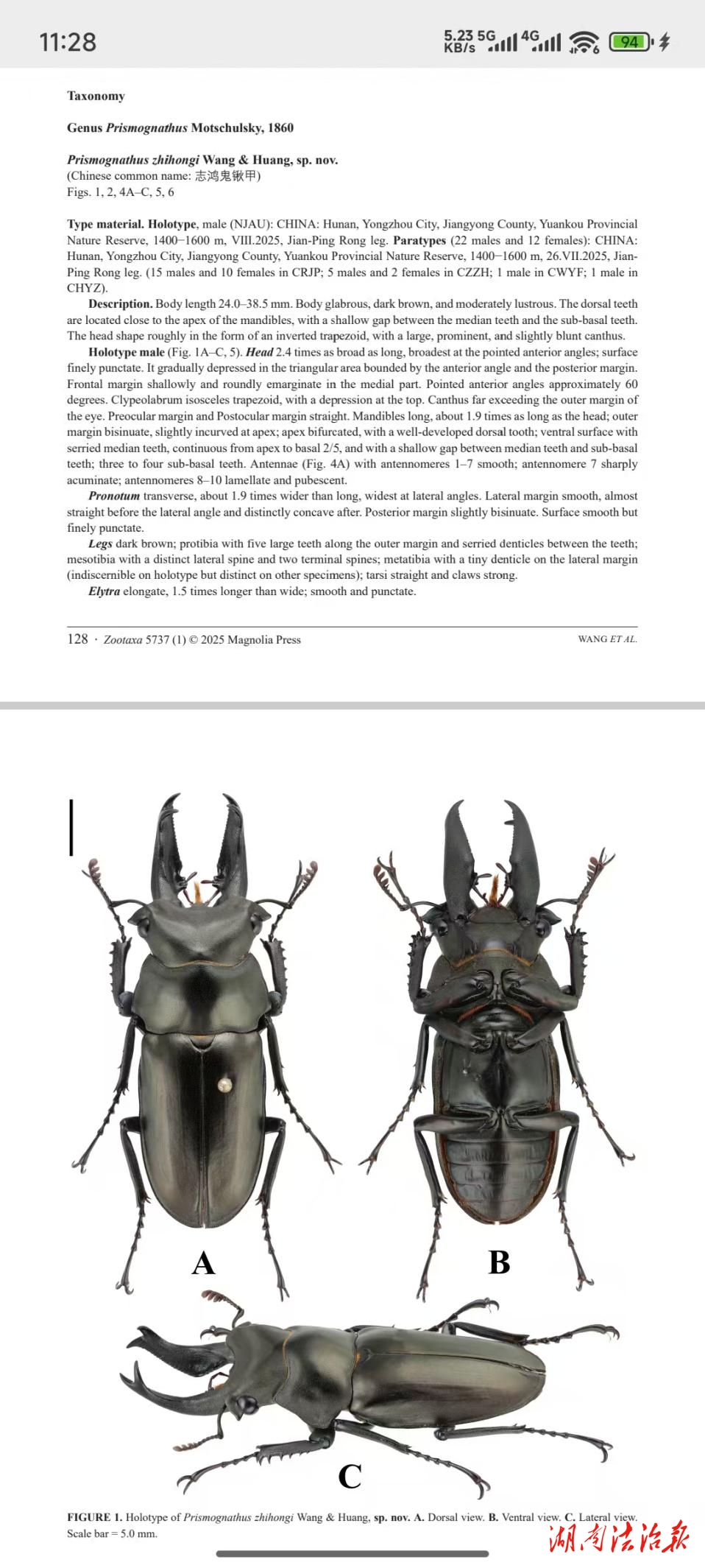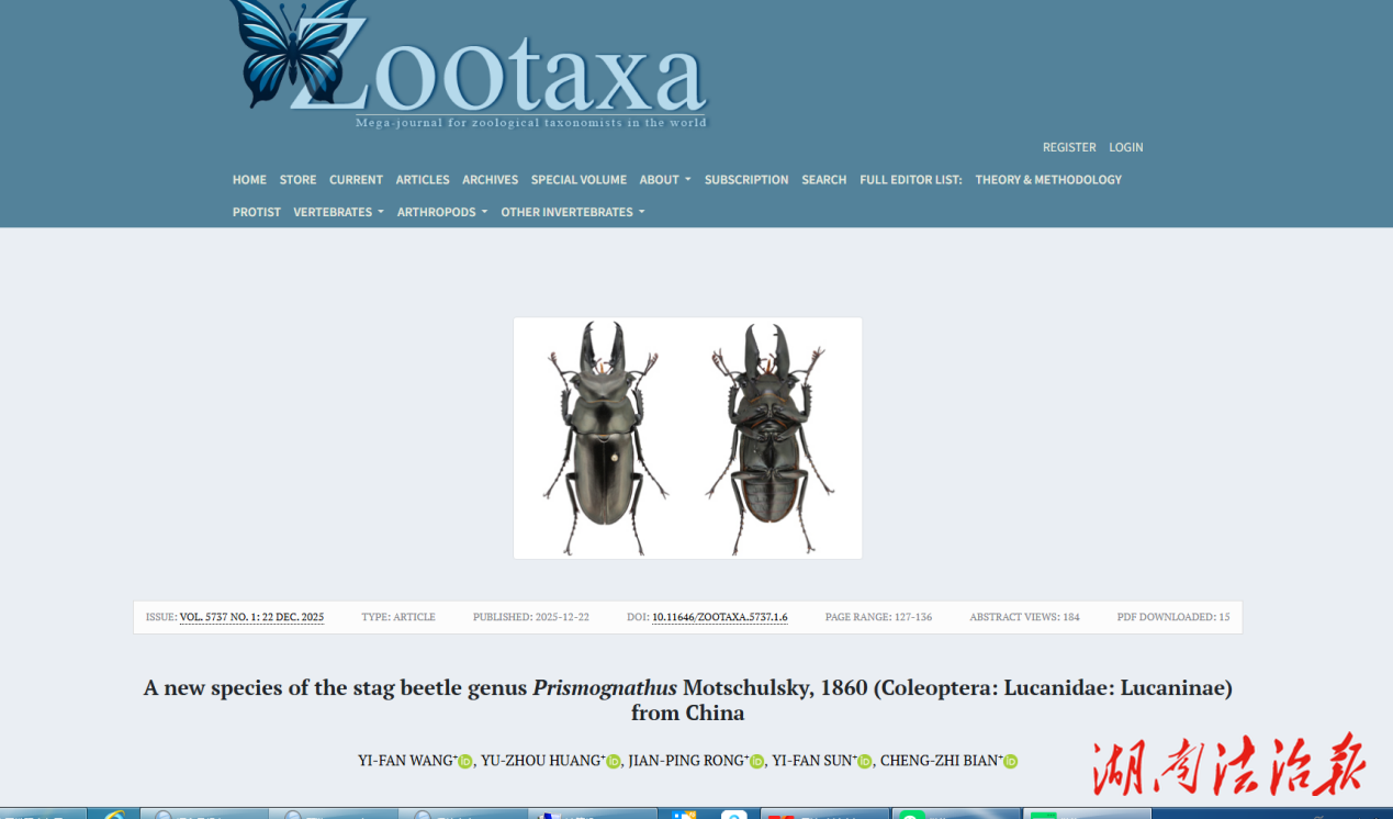湖南法治报讯(通讯员 肖东晓 容建平)近日,国际权威动物学期刊《Zootaxa》正式发表一项昆虫分类学新成果:湖南江永源口省级自然保护区科研人员在野外调查中发现的锹甲科物种,被确认为中国首次记录的新物种。这是该保护区自主发现并成功发表的首个昆虫新物种,标志着我国南岭山脉昆虫多样性研究取得重要突破。