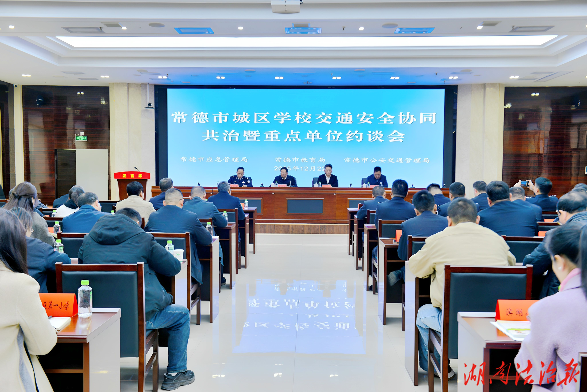 12月22日,为筑牢市城区校园师生交通安全防线,湖南常德市应急安全生产委员会办公室联合市教育局、市公安局交管支队召开市城区学校交通安全协同共治暨重点单位约谈会。会上,播放了《市城区学校周边交通安全风险警示教育片》,通报了学校交通安全形势分析情况,下发了《市城区学校周边交通安全整治工作方案》,并从当日起,正式启动多部门协同共治校园及周边道路交通安全整治行动。