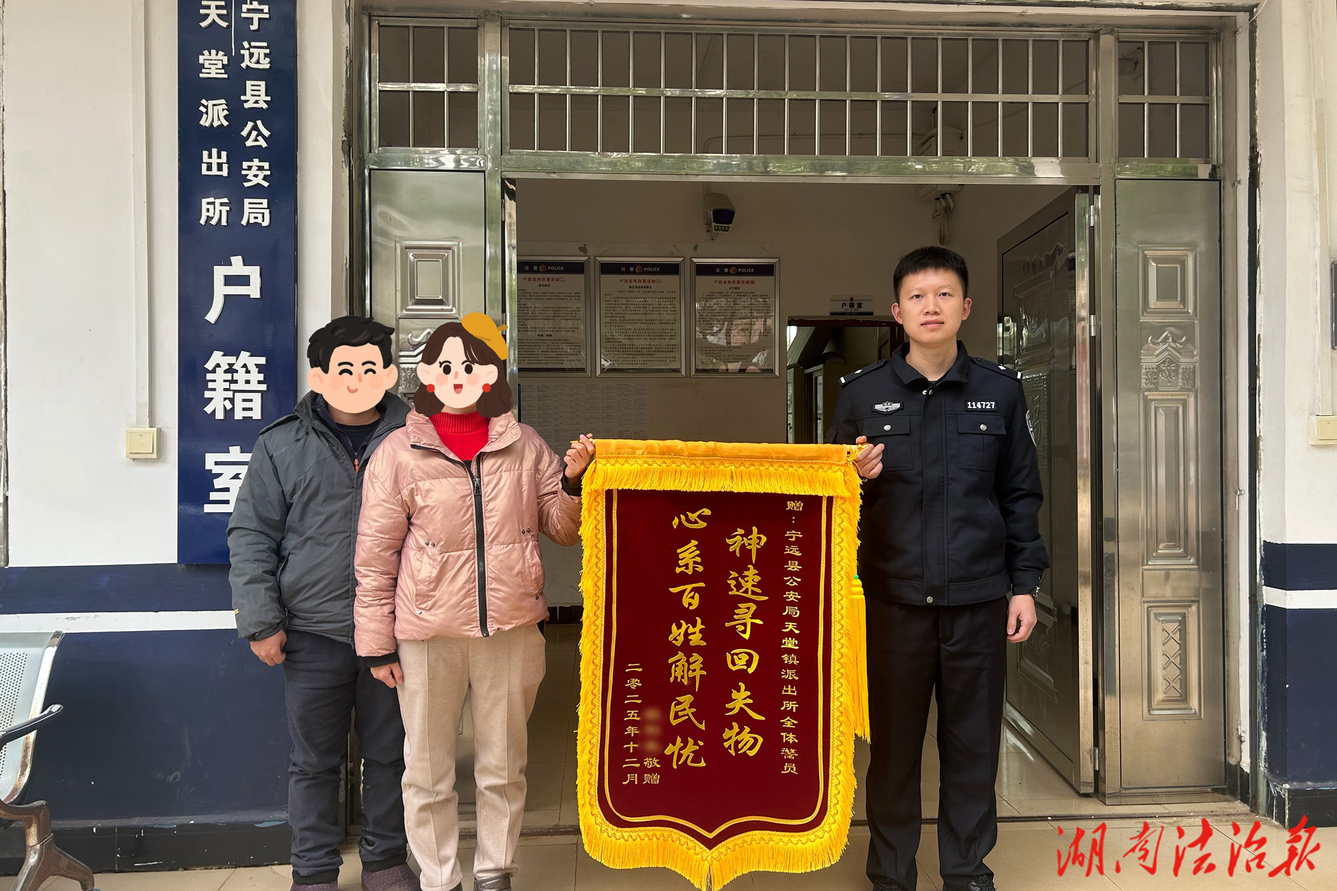 “手机丢了我本来都不抱希望了,没想到民警这么上心,太感谢你们了!”12月22日上午,欧阳先生将一面印有“神速寻回失物,心系百姓解民忧”的锦旗送到天堂派出所民警手中,诚挚感谢民警的帮助。