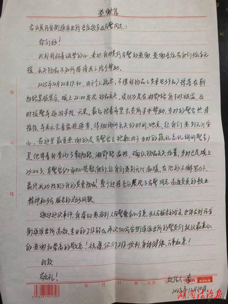 这封朴实的感谢信,不仅承载着群众的衷心谢意,更是对民安派出所基层警务工作的最大肯定,也激励着全体民警辅警继续忠诚履职,守护辖区平安。