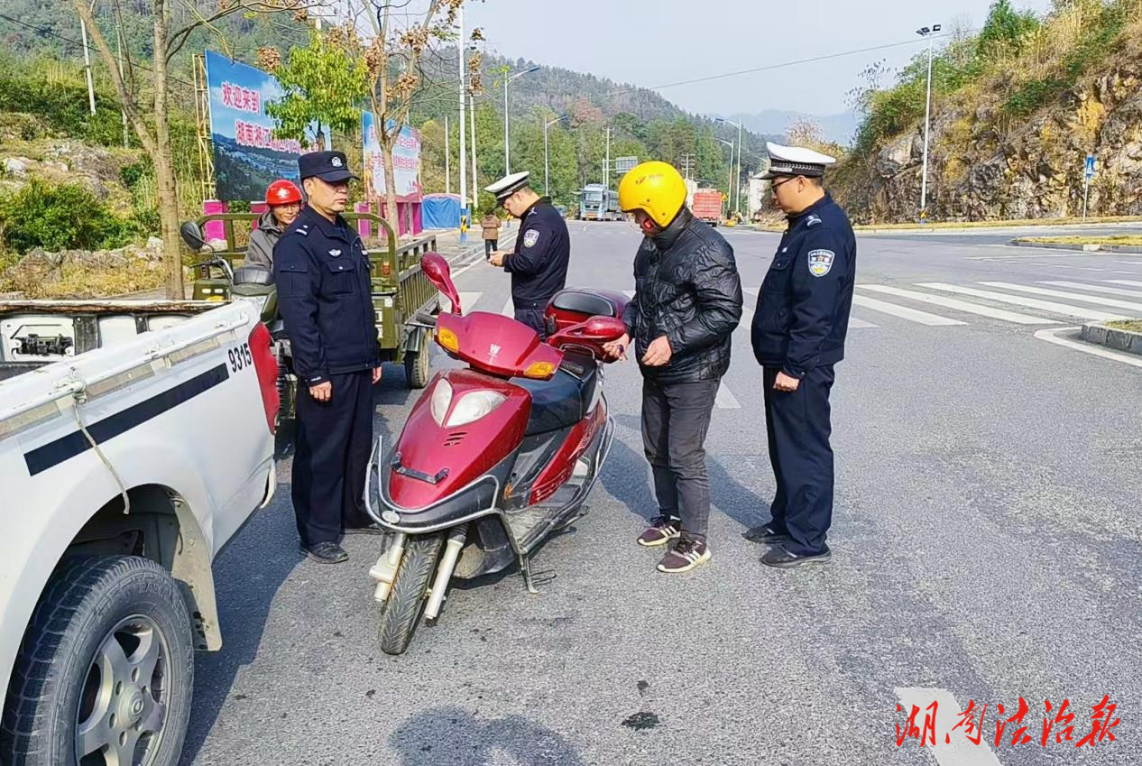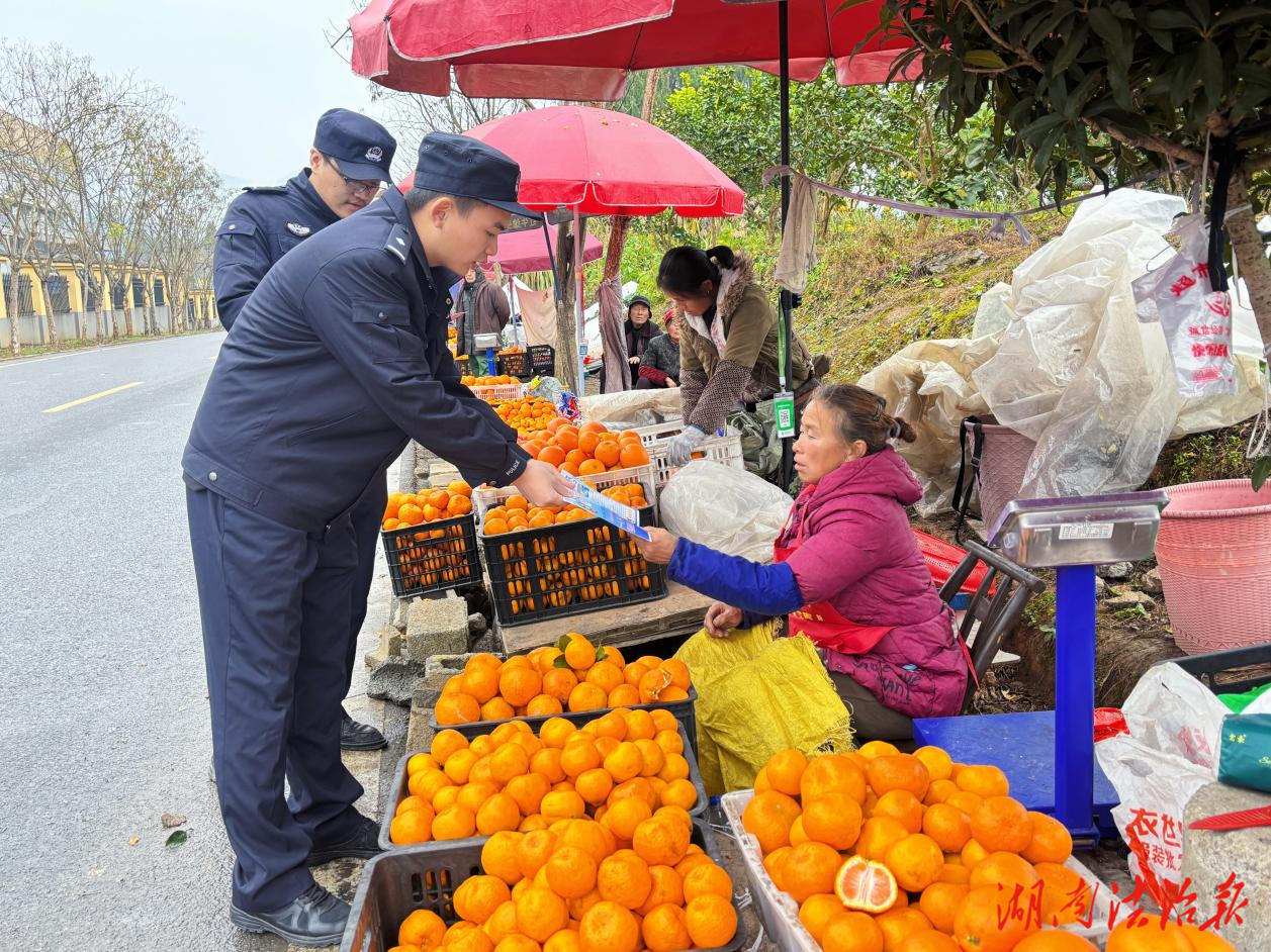随着柑橘集中上市,大量外地货运车辆涌入里耶镇,导致沿线交通压力陡增。为保障果品运输通畅,里耶派出所将交通管理服务延伸至果园、交易市场及乡村道路沿线。民辅警们向果农和驾驶员发放交通安全宣传单,面对面讲解道路通行注意事项。“老板,路边交易一定要选宽阔安全地段,在来车方向摆好反光三角牌和锥筒,切勿在弯道、坡道随意停车啊!”民警对着正在装车的果农反复叮嘱。同时,常态化开展路面巡查执法,严查摩托车、电动自行车驾乘人员不佩戴安全头盔等违法行为,做到发现一起、纠正一起。