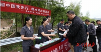 永州中院联合蓝山县法院在湖南湘江源国家森林公园开展保护环境资源普法活动。