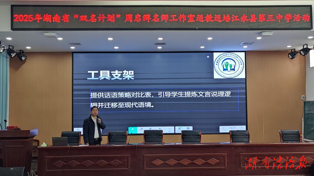 湖南法治报讯(通讯员 贺燕琦 李满霞)12月30日,湖南省“双名计划”周启群名师工作室带着前沿的教学理念与丰硕的研究成果,以“基于深度学习的统编高中语文群文阅读读写一体化教学研究”成果推广为主题,在江永县第三中学开展送教送培活动。此次授课活动阵容强大,内容丰富,形式多样,湖南省名师工作室主持人和导师以讲座形式稳根基,省卓越教师、省骨干教师和县高中语文学科带头人及骨干教师以示范课形式重落实。工作室以看得到、摸得着、学得到、用得上为送教送培理念,有效赋能县域薄弱高中学校的语文教育逐步提升。