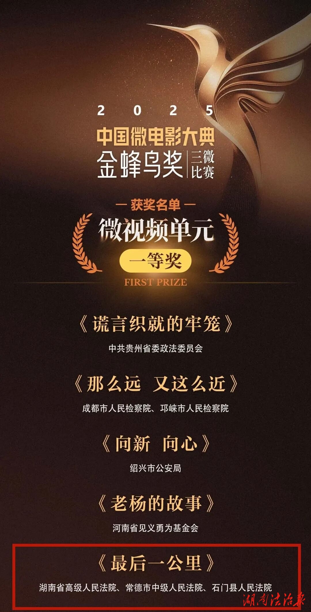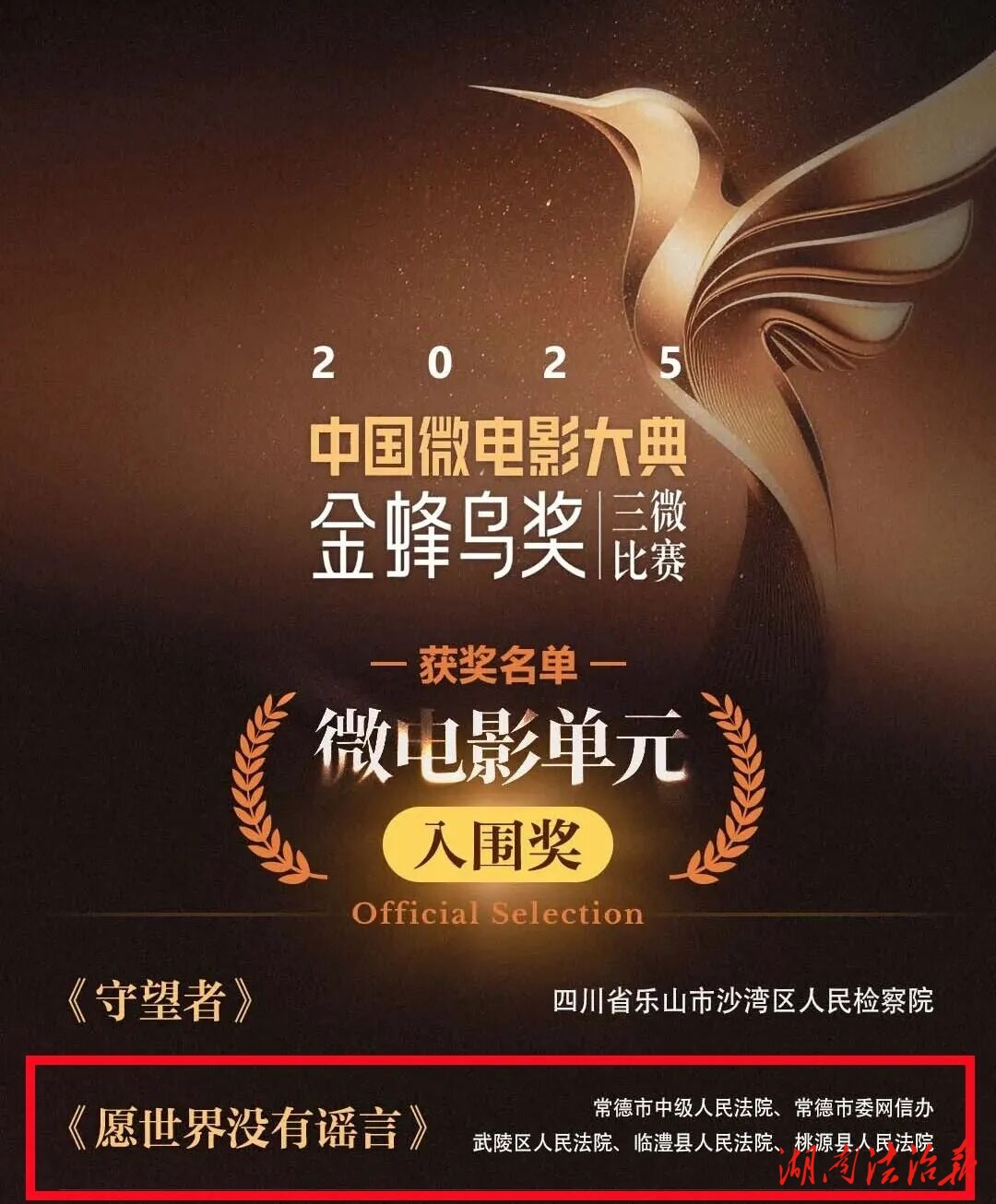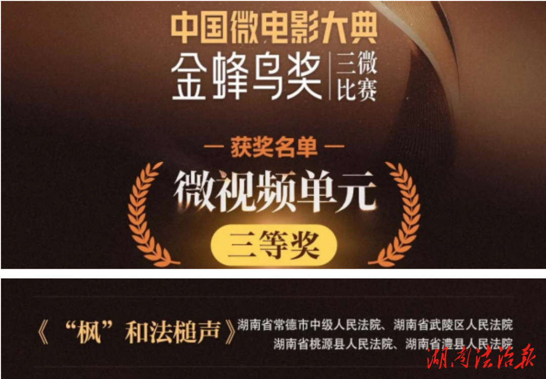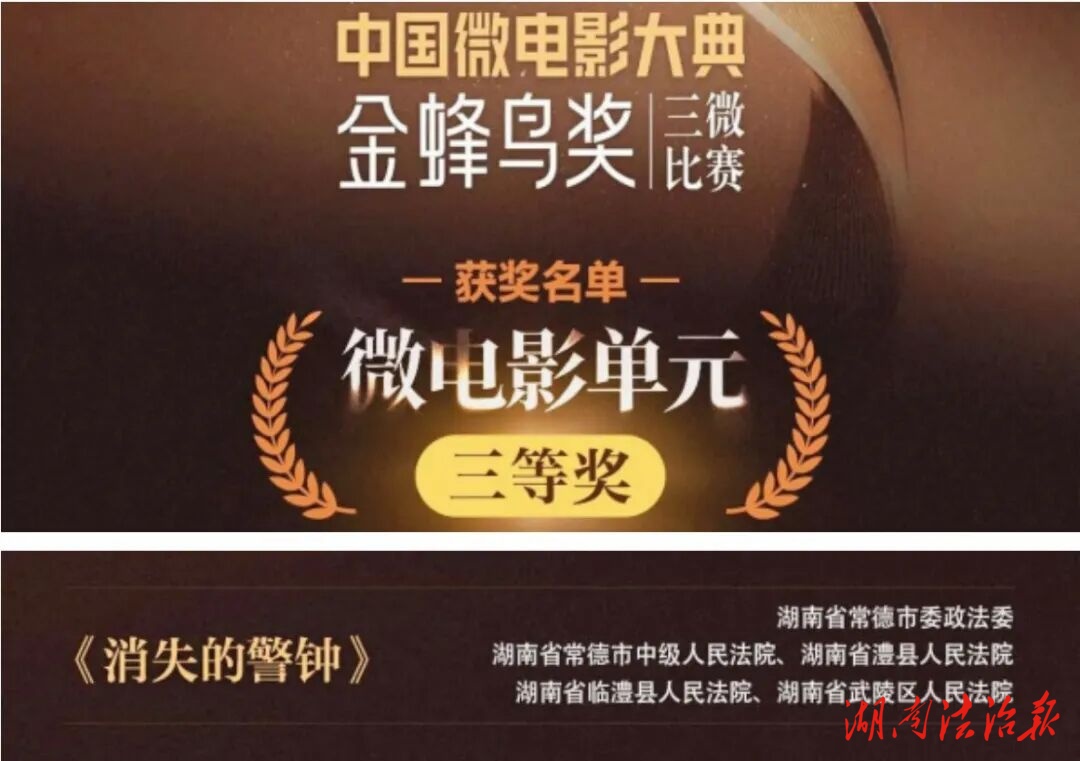 2025年12月30日,2025·中国微电影大典“金蜂鸟奖”三微比赛历经层层筛选与评委会的严谨评审,获奖表彰名单正式出炉。常德中院联合湖南高院、常德市委政法委、常德市委网信办、部分基层法院等单位制作的4部普法微视频(微电影)获奖。