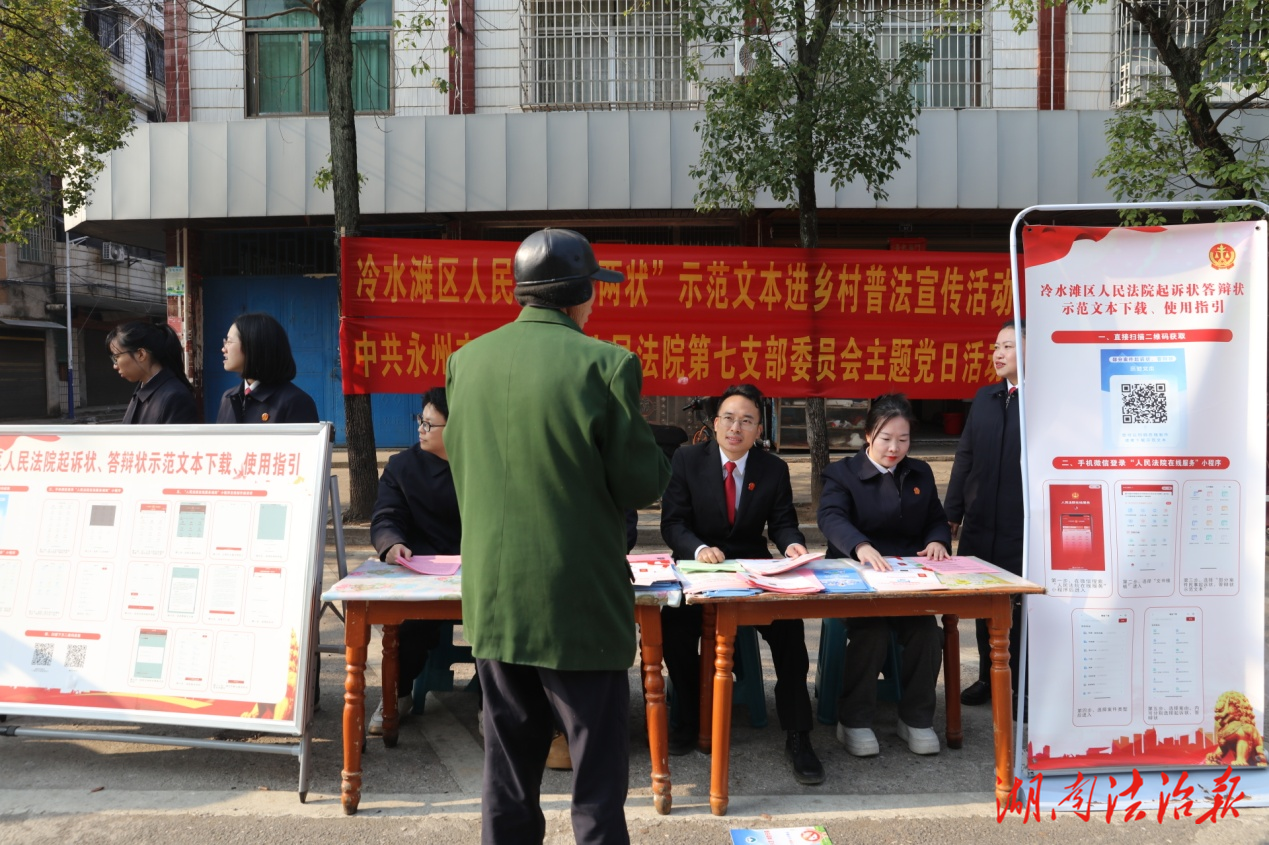 冷水滩区人民法院第七党支部联合黄阳司法庭、普利桥法庭、岚角山法庭10余名干警前往黄阳司镇的集市摆起了“普法地摊”,面对面宣传推广“两状”示范文本,让司法服务更贴近群众需求、契合实务场景。