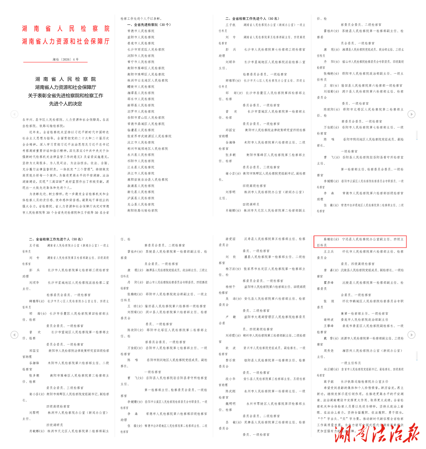 湖南法治报讯(通讯员 刘华)1月8日,湖南省人民检察院、湖南省人力资源和社会保障厅下发《关于表彰全省先进检察院和检察工作先进个人的决定》,宁远县人民检察院蔡璐依同志荣获“全省检察工作先进个人”。
