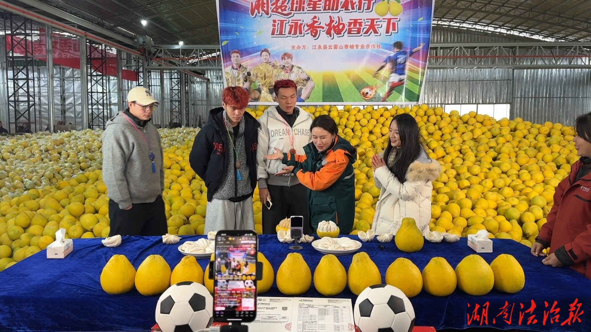 湖南法治报讯(通讯员 陈平成 毛文涛)湘超联赛桂冠加身,永州健儿载誉归来。这份属于体育赛场的荣耀,正转化为助力乡村振兴的强劲动能。1月2日,永州队人气组合“番茄三兄弟”唐嘉年、谷文杰、林昊,以及湘超最佳运动员高响,走进江永县粗石江镇开展直播助农活动,为当地特色香柚站台吆喝,让冠军热度精准对接农产需求,书写体育赋能乡村振兴的生动篇章。