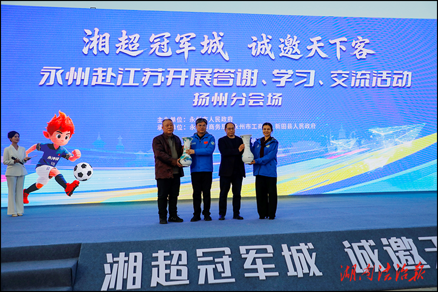活动现场举行了新田推广大使聘书颁发仪式,扬州好人谢锋、自媒体达人吴小鱼等获聘。“能为家乡新田与扬州的交流搭建桥梁,我倍感荣幸。”谢锋在分享时动情地说,将以实际行动助力两地情谊延续。随后,扬州市湖南商会等赠送世界和平瓶,寓意“扬永一家亲”;两地球迷代表互换球衣,球衣上的队徽见证着这份跨越地域的热爱与联结。