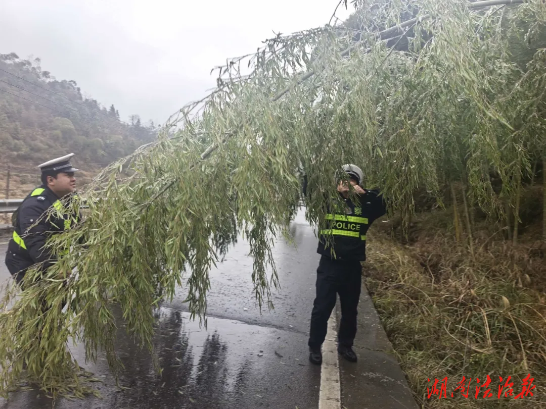 发现隐患后,交警当即停车,迅速做好现场安全防护,随即开展隐患清除工作。经过及时处置,倾斜竹子被全部清理,路面通行障碍被彻底消除,有效保障了低温天气下辖区道路的安全畅通。