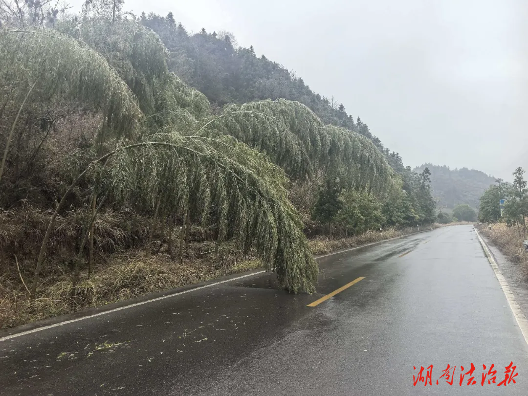 1月20日,会同交警在省道S556金龙岩脚村路段开展巡查工作发现,道路旁竹子因低温天气出现结冰现象,部分竹体受冰层重量影响往马路中间倾斜,不仅占用部分车道,更对过往车辆通行构成严重安全隐患。