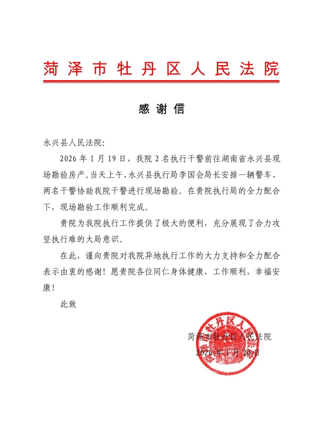 一纸感谢信,拳拳协作情。近日,永兴法院收到一封来自山东菏泽市牡丹区法院的感谢信。信中言辞恳切,既对永兴法院执行局在异地房产勘验工作中的全力支持、高效协助致以诚挚谢意,更对两地法院打破地域限制、合力攻坚执行难给予了高度认可。