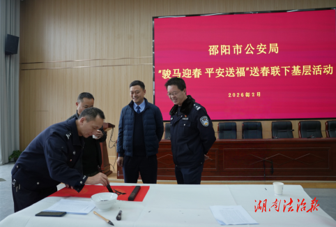 湖南法治报讯(通讯员 尹方倩 潘浩 蒋景芬)骏马迎春添新色,墨香送福润警心。为深化警营文化建设,传递组织关怀,营造喜庆祥和的节日氛围,2月5日,邵阳市公安局组织书法名家与警营书法爱好者组成文艺小分队,走进洞口县公安局高沙派出所、局机关开展“骏马迎春 平安送福”送春联下基层主题活动,以笔墨承载祝福,以文化凝聚警心,为坚守一线的公安干警送上真挚的新春问候。