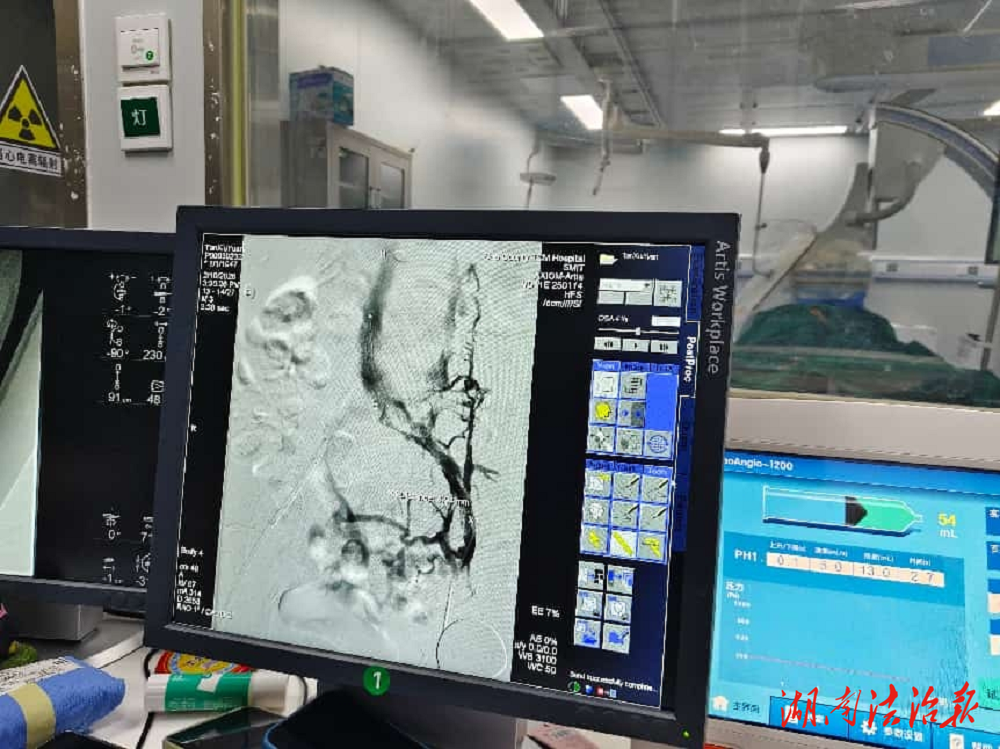 两位患者入院后,道县中医医院外二科医疗团队第一时间启动多学科会诊机制,联合相关科室对患者的病情进行全面、缜密评估。考虑到患者病情危重、身体状况复杂,传统药物治疗周期长、出血风险高,且无法快速清除血栓、规避肺栓塞风险,团队在与患者家属充分沟通、告知治疗方案及风险后,决定邀请长沙市第一医院贺超贵老师来院指导,为两位患者在数字减影血管造影(DSA)设备引导下,实施目前先进的微创介入手术——经皮穿刺下肢深静脉取栓术,同步开展滤器植入、静脉支架植入,实现“一站式”血栓救治。
