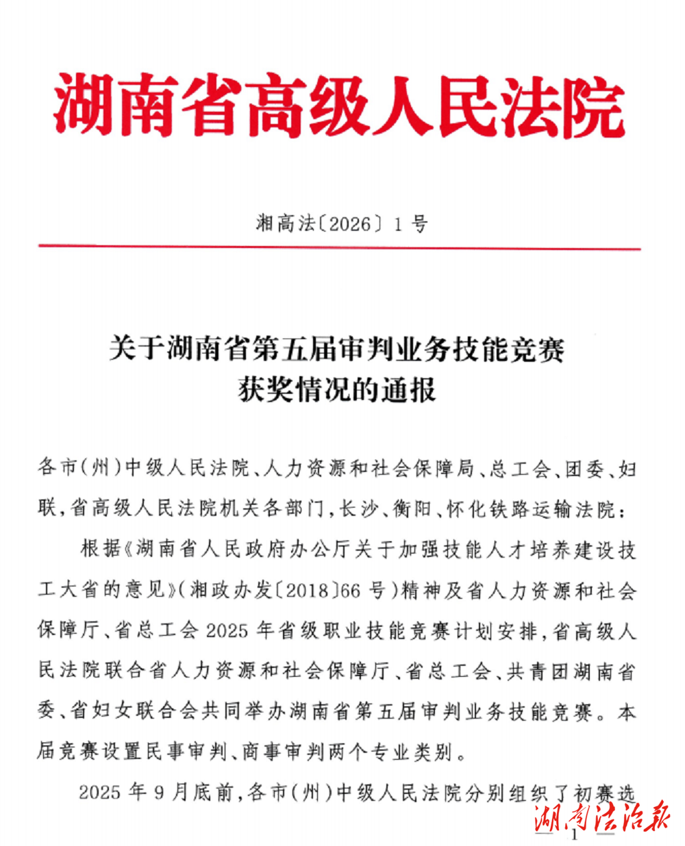 湖南法治报讯(通讯员 陈佳)近日,由湖南省高级人民法院联合省人力资源和社会保障厅、省总工会、共青团湖南省委、省妇女联合会共同举办的湖南省第五届审判业务(民事、商事审判专业)技能竞赛,经过初赛、决赛两轮激烈角逐,最终顺利圆满完赛。