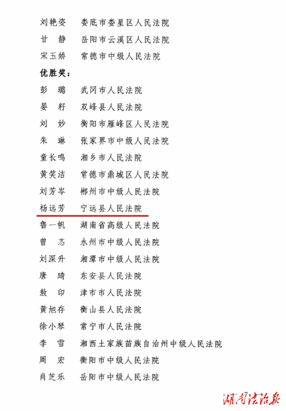 湖南省高级人民法院发布《关于湖南省第五届审判业务技能竞赛获奖情况的通报》,对获奖的集体与个人予以通报表扬。其中,宁远县人民法院杨远芳在商事审判专业竞赛中荣获优胜奖。