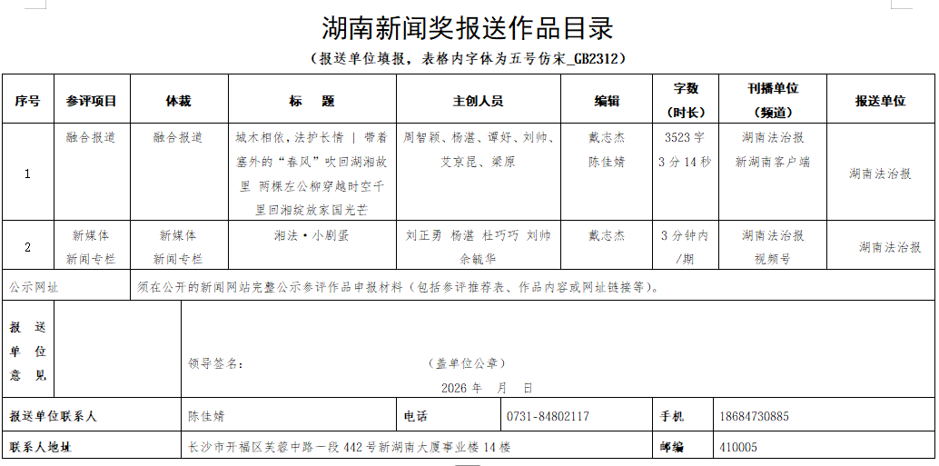 按照《湖南新闻奖评选办法》和《关于开展2025年度湖南新闻奖参评作品报送工作通知》要求,经湖南金鹰报刊社有限责任公司审核同意,湖南法治报以下两件融合报道、应用创新和新媒体新闻专栏作品参评2025年度湖南新闻奖,现在网上进行公示,公示期为2026年3月12日至3月17日。