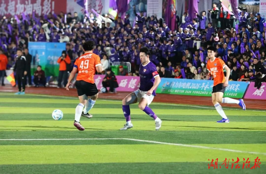 湖南法治报讯(通讯员 黄新 李月娟 陈欣)3月28日晚,科力尔电机2026年永州市足球联赛南有新田队对战冷水滩勇闯天涯队在新田二中激情上演。南有新田队坐镇主场,经过90分钟激烈角逐,最终以4比0战胜冷水滩勇闯天涯队,为现场球迷奉献了一场精彩的进球盛宴。毛联群、周宏武、郑龙杰等县领导及嘉宾到现场观赛。