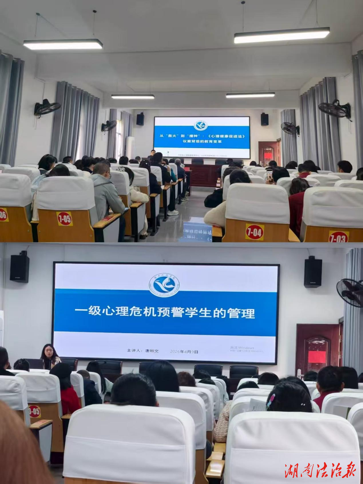 4月15日上午,永州市青少年心理健康协会会长、湖南科技学院心理中心主任涂巍教授以《从救火到播种:〈心理健康促进法〉议案背后的教育变革》为题,深入剖析了心理健康教育从应急干预走向预防性、发展性教育模式的转型逻辑,引导教师们重新审视自身在心理健康教育中的角色定位。下午,唐晰雯老师围绕《一级心理危机预警学生的管理》和《个体心理咨询》两个主题,结合真实案例,详细讲解了危机学生的识别、分级管理流程及个体咨询中的关键技术,帮助教师们掌握科学、规范的工作方法。
