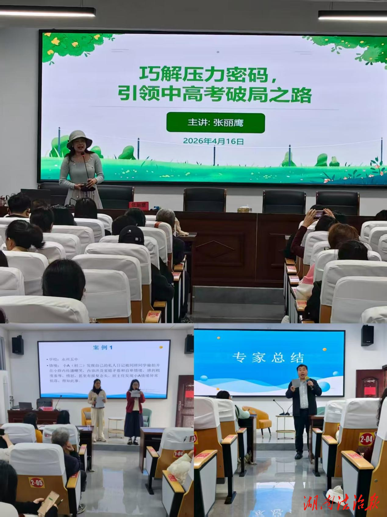 4月16日上午,永州师范高等专科学校教育心理学副教授张丽鹰为学员们带来了《巧解压力密码,引领中高考破局之路》和《学生心理辅导:缓解焦虑,激发潜能》两场精彩讲座。她从中高考备考实际需求出发,分享了教师压力管理与心态调整策略,并围绕如何构建支持性学习环境、激发学生内在动力等方面与学员们展开深入交流。下午,全体学员分组进行心理咨询案例实操与模拟现场演练,由唐志雄、张丽鹰、周春丽三位专家进行现场点评与指导。学员们积极投入,模拟真实咨询场景,专家们针对咨询过程中的共情、提问、干预技巧等逐一剖析,现场学习氛围浓厚。