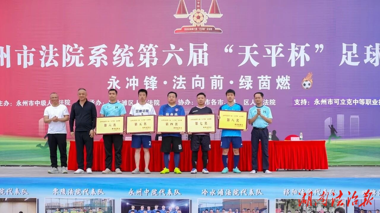 比赛最终决出冠、亚、季军及第四至第八名。东安县法院足球队荣获冠军,永州中院正义先锋队获得亚军,冷水滩法院足球队获得季军。零陵法院独角兽队、双牌法院足球队、新田法院足球队、蓝山法院足球队、宁远法院足球队分列第四至第八名。