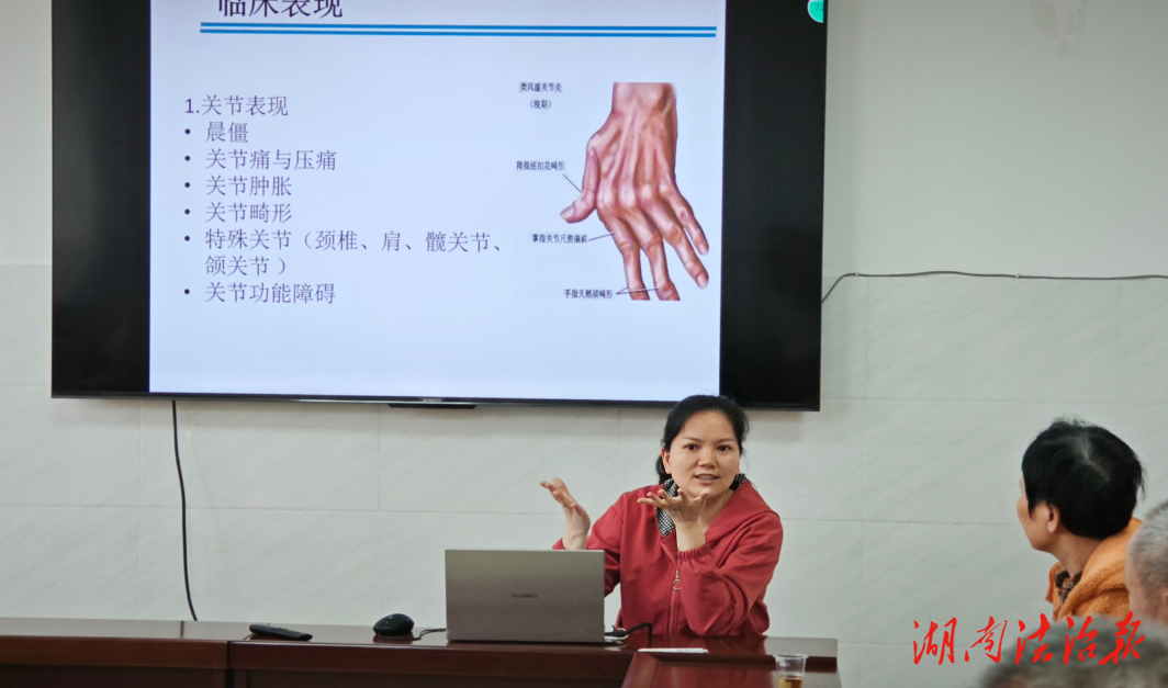 湖南法治报讯(通讯员 欧阳丽娟)春季气温波动较大,类风湿关节炎患者易因关节受凉、劳累诱发病情反复。为帮助患者平稳度过季节交替期,4月23日下午,宁远县医共体总医院中医医院院区在住院部六楼会议室,为在院患者及家属开展了一场主题为《类风湿关节炎》的健康科普知识讲座。