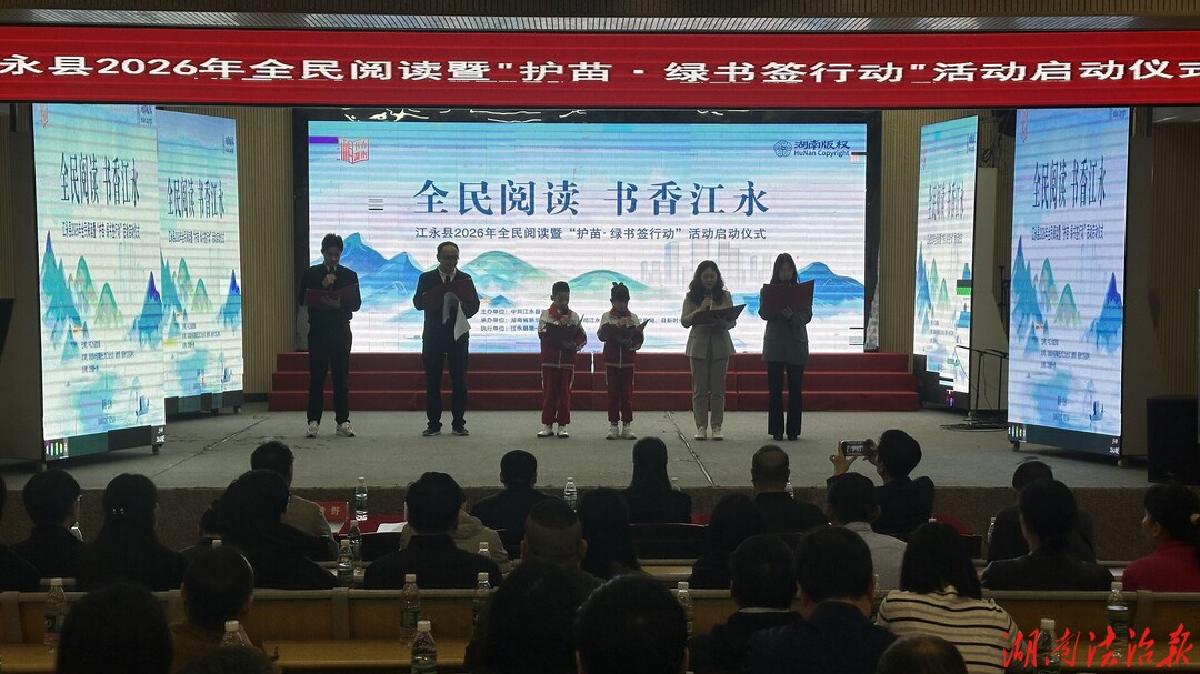 湖南法治报讯(通讯员 谢文彬)4月24日,江永县2026年全民阅读暨“护苗·绿书签行动”启动仪式在县第一小学报告厅举行。县委常委、宣传部部长蒋丽君,县人民政府副县长提名人选曹孝卫出席仪式,全县各相关单位负责人、乡镇宣传委员及教育系统代表齐聚现场,共同开启全县全民阅读与护苗专项行动新篇章。