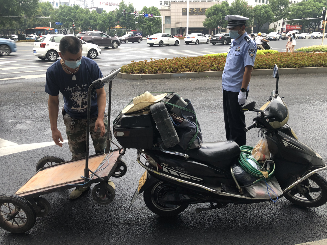 当天早上8时17分,常德公安交警直属一大队二中队民警辅警正在武陵大道宏达路口开展摩托车、电动自行车“两车”整治行动。这时,迎面驶来一辆电动自行车,驾驶人未佩戴安全头盔,且车后疑似拖挂了一个小板车。行驶过程中,小板车不时左右滑动,周边驾驶人和车辆连忙避让,十分危险。民警立即将其拦下。经询问驾驶人张某得知,他是做装修活的师傅,平时干活需要很多工具,自己的电动自行车又无法载货太多,便在自己的电动自行车上加装了一个钩子,将工地上用的小板车挂在后面拉载工具。