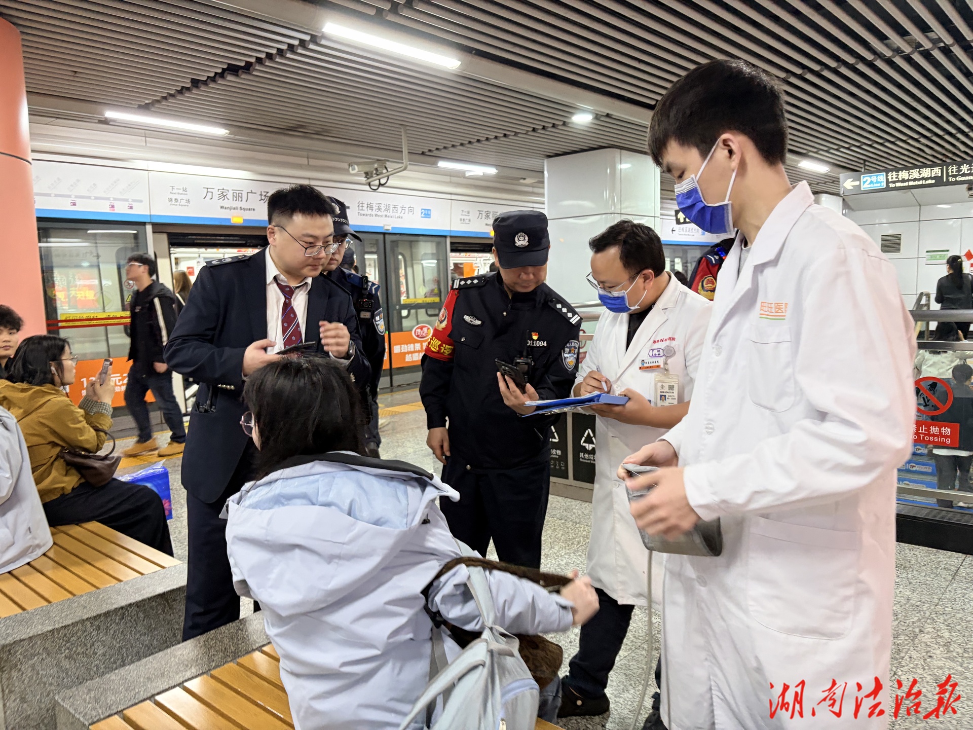 湖南法治报讯(通讯员 邵青 李博)4月7日晚6时30分许,地铁5号线万家丽广场站正值晚高峰。突然,一阵急促的求助声冲破站台的人来人往:“快来人啊!有人晕倒了!”