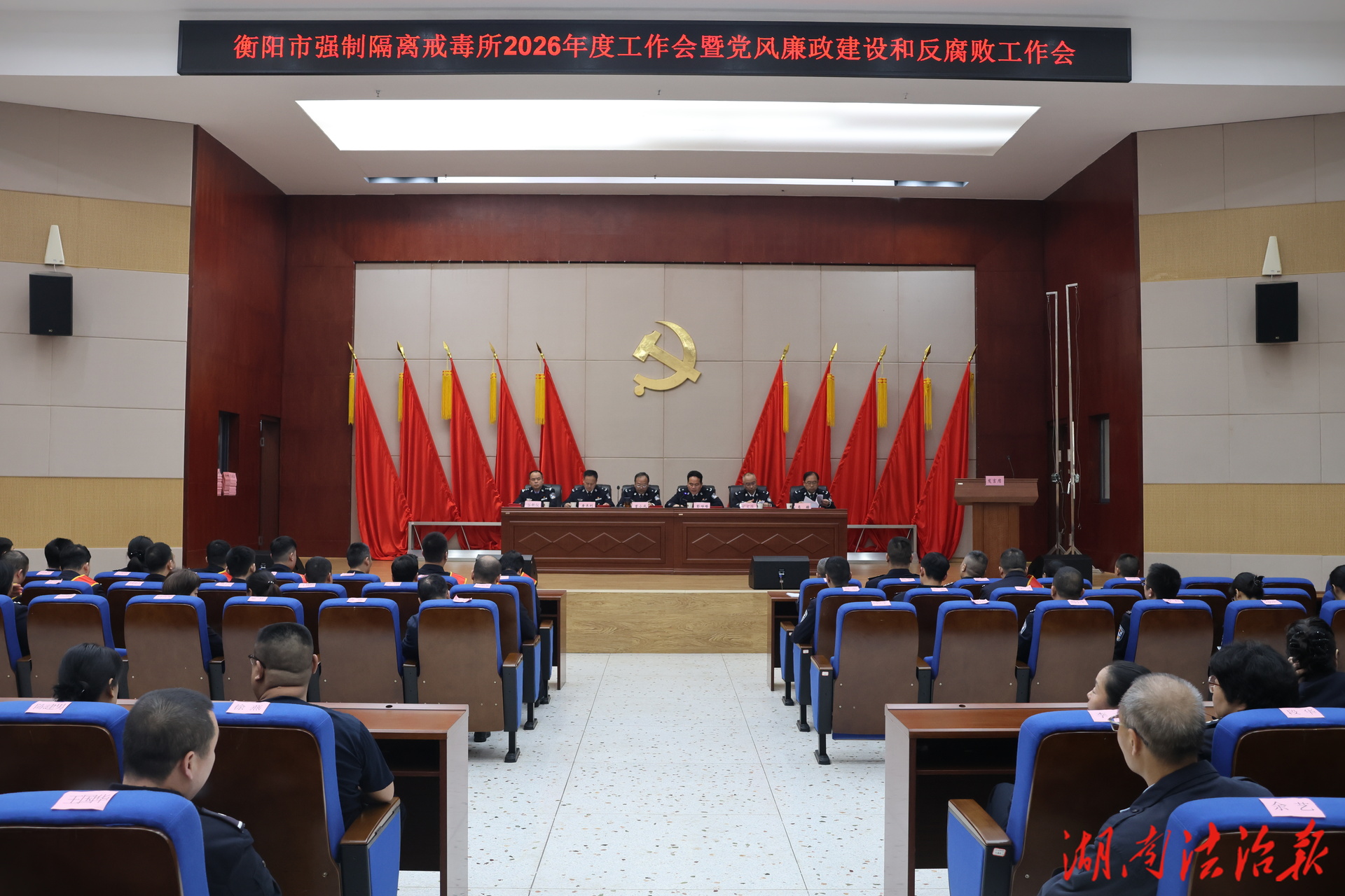 湖南法治报讯(通讯员 肖诺峰)4月14日,衡阳市强制隔离戒毒所召开2026年度工作会暨党风廉政建设和反腐败工作会议。会议全面总结2025年度工作成效,客观分析当前戒毒工作与党风廉政建设面临的新形势、新任务,周密部署2026年度重点工作。所党委书记、所长曾小成作2026年度工作报告,所党委委员、纪委书记旷文改作党风廉政建设和反腐败工作报告。会议由所党委副书记、政委彭峥嵘主持,全体所领导及民警职工参加会议。