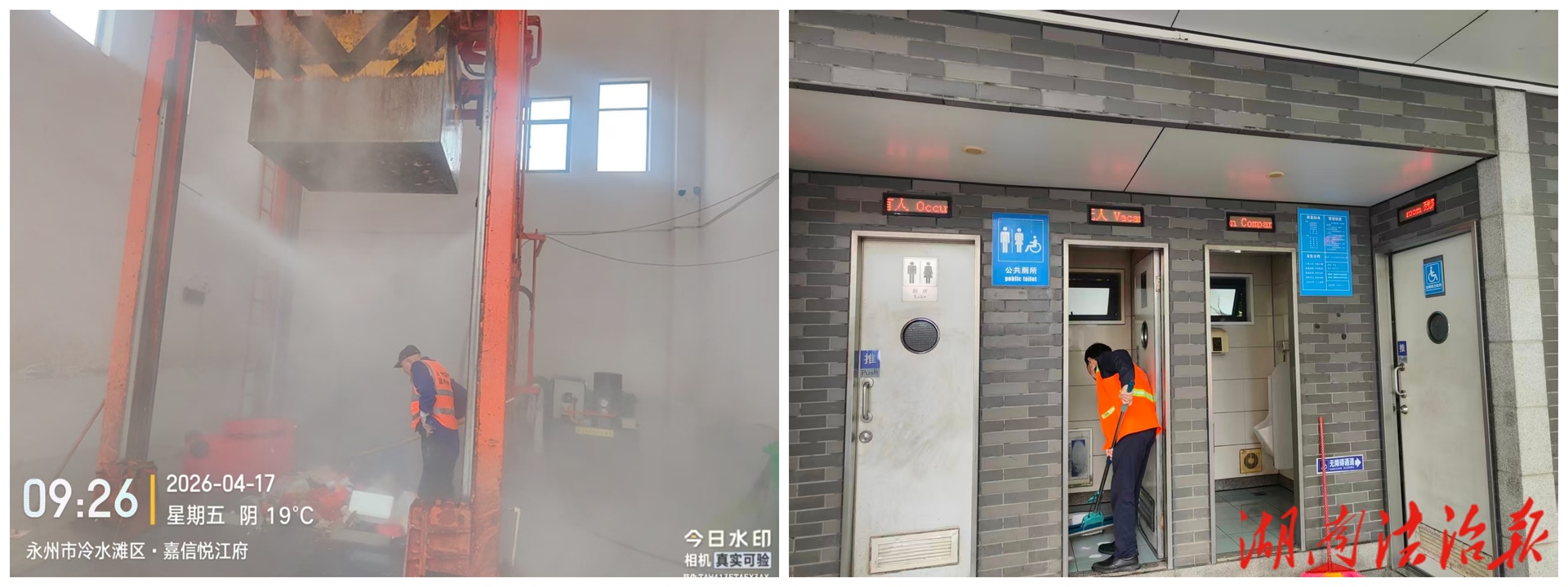 (图为工作人员对赛事沿线公厕进行保洁 周顺舟 秦海民 摄)