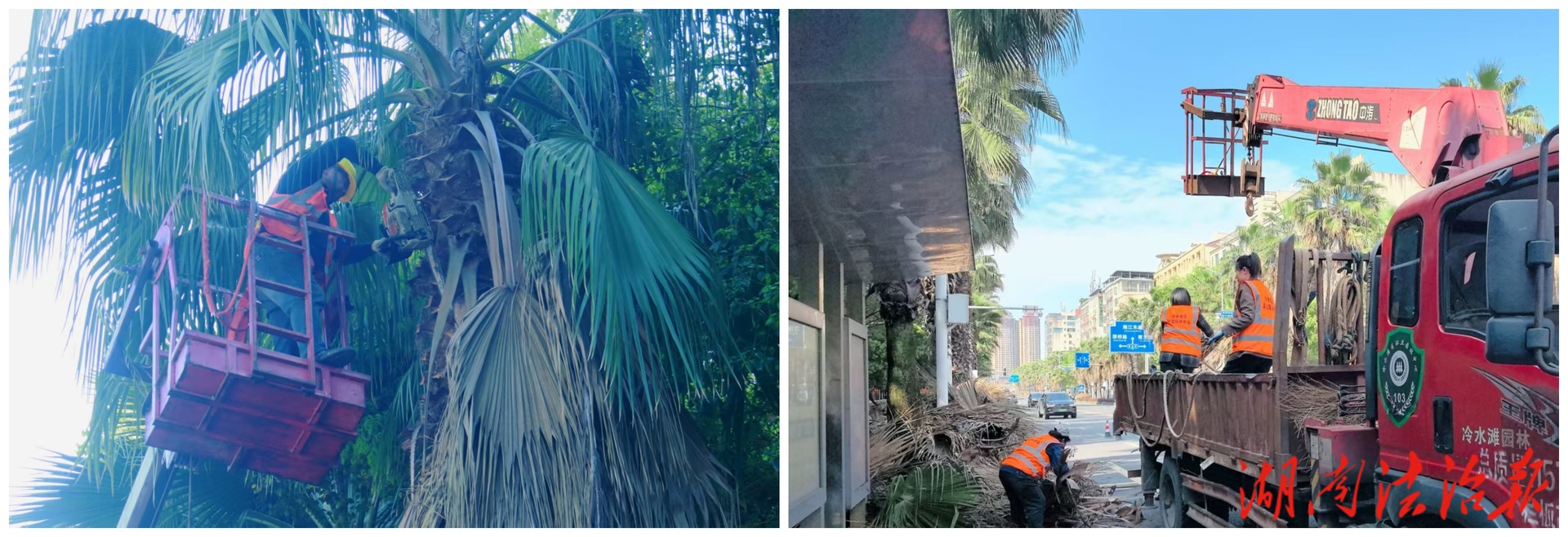 (图为工作人员修剪与清运马拉松赛事沿线老人葵枯枝 张禹丰摄)