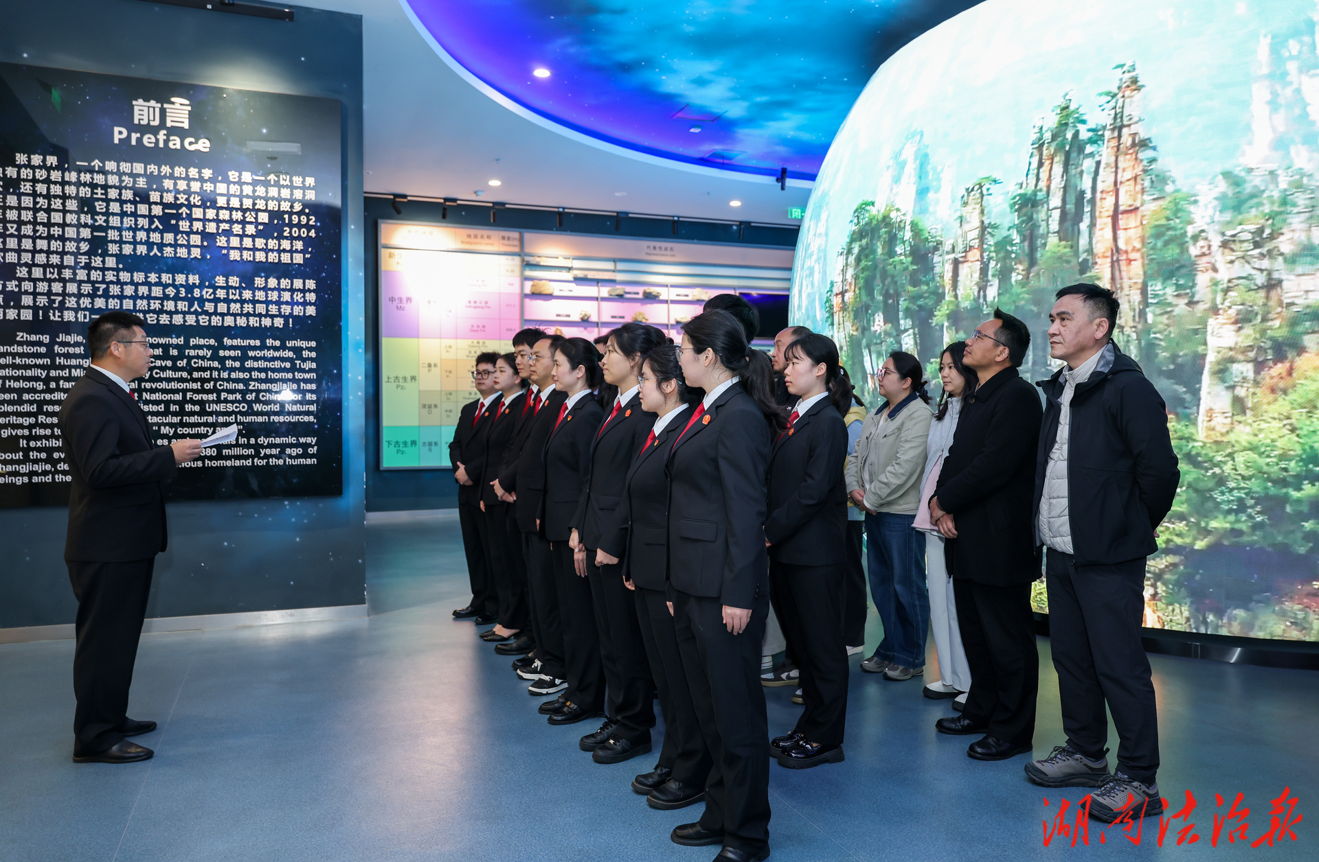全体党员干警佩戴党员徽章,在张家界武陵源世界地质公园博物馆内,认真聆听党组书记、院长汪坚以“青山不负人,法治守初心”为题讲授的“会呼吸”微党课。党课紧扣法院环境资源审判实践,结合补植复绿、生物多样性保护等典型案例,生动阐释“一名党员就是一面旗帜,一份判决守护一片青山”的深刻内涵,引导全体党员干警坚守司法为民初心,扛起生态保护司法职责,以党建红引领生态绿。