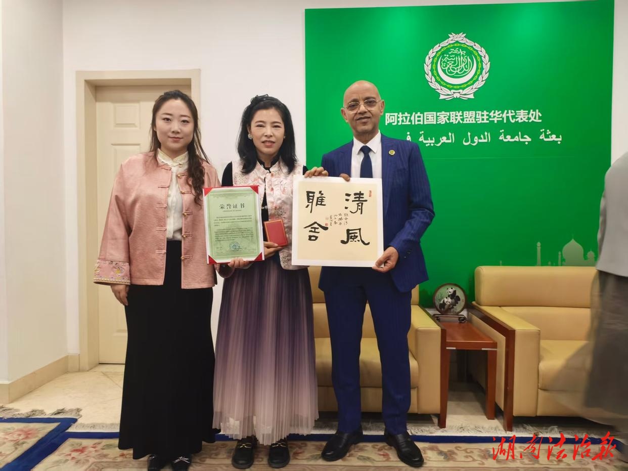 湖南法治报讯(通讯员 李敏)4月24日,湖南长沙书画家、中名联艺术家高泉燕应邀走进阿拉伯22国联盟驻华代表处,与阿盟驻华大使艾哈迈德·穆斯塔法·法赫米大使开展深度文化交流,以笔墨为媒,传播中华国粹,展示大美湖湘风采。