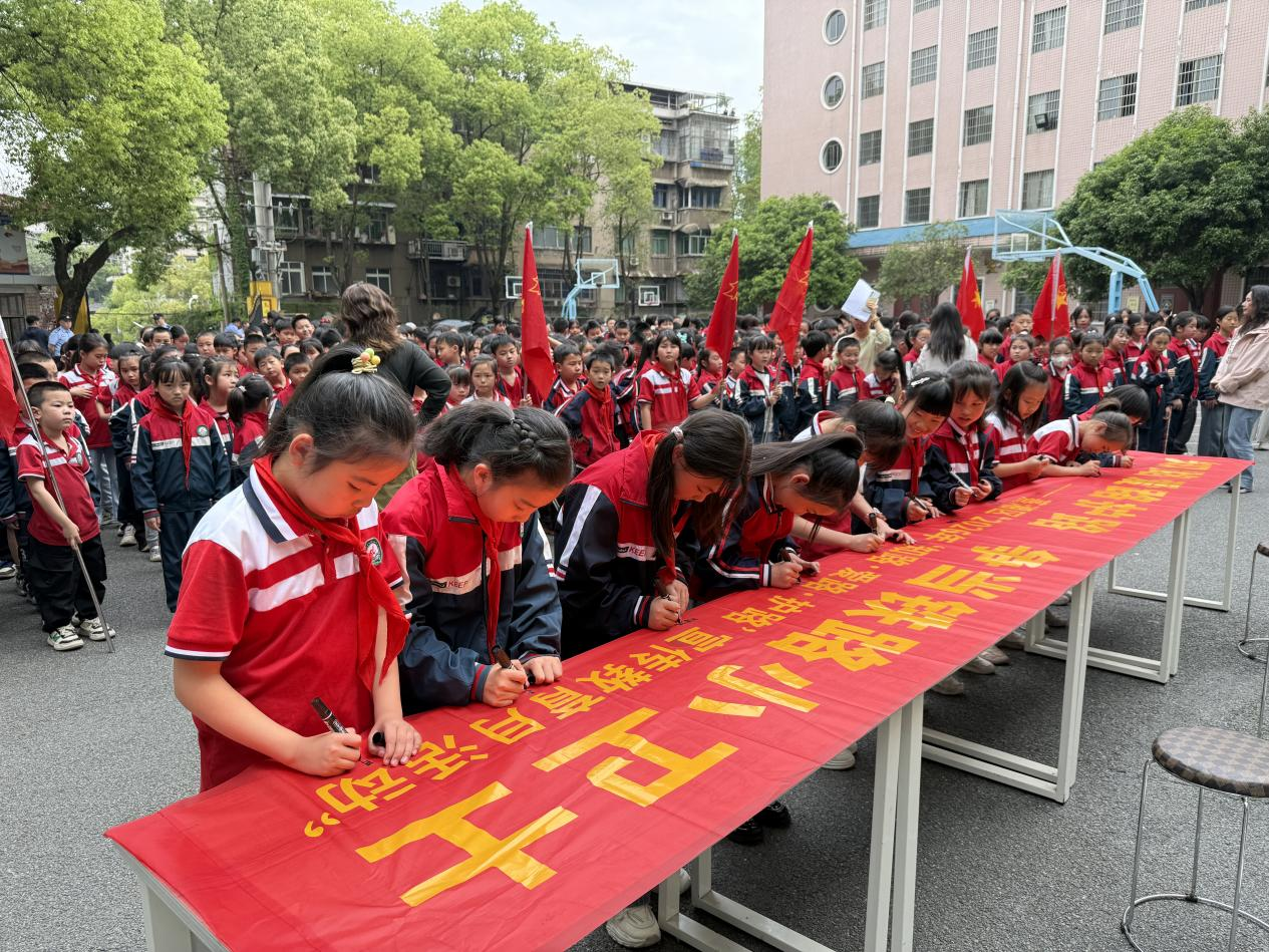 在“知路爱路护路 争当铁路小卫士”的红色横幅上,全校师生依次郑重签下自己的名字。一笔一画,是承诺,更是责任。五年级学生李雨桐签完名后激动地说:“从今天起,我要做家里的‘铁路安全宣传员’,告诉爸爸妈妈和邻居,不能在铁路边散步、放风筝。”