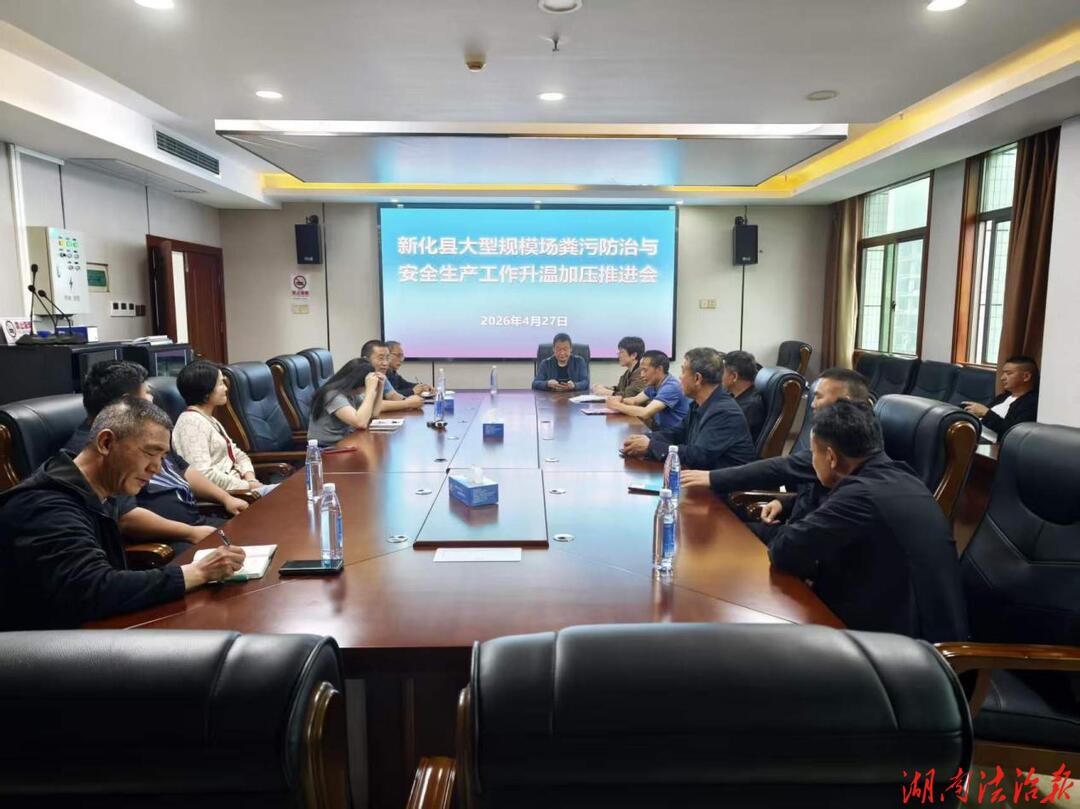 湖南法治报讯(通讯员 伍狄)4月27日,新化县畜牧水产事务中心联合娄底市生态环境保护局新化分局,召开全县大型规模养殖场粪污防治升温加压推进会议,持续推进养殖场粪污污染防治,落实企业养殖污染治理主体责任,会议由新化县畜牧水产事务副主任曾灿庄主持,全县20余家大型生猪规模养殖场负责人参加。