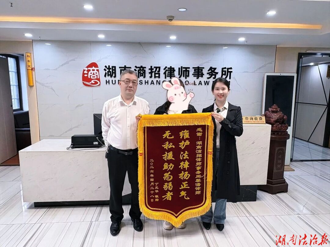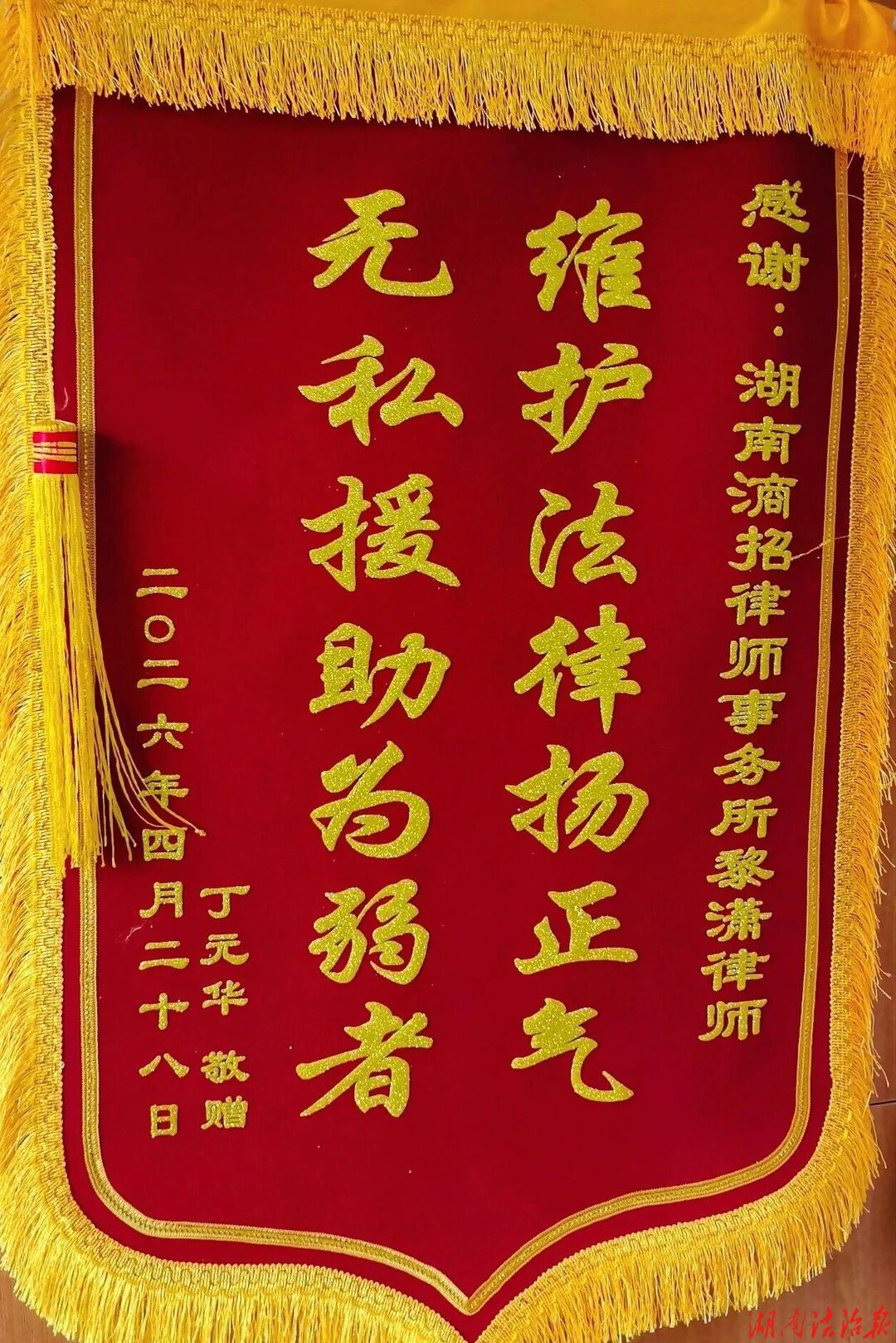 湖南法治报讯(通讯员 黎潇)2026年4月28日,湖南滳招律师事务所内暖意融融、情谊满满。当事人丁女士特意送来一面印有“维护法律扬正气,无私援助为弱者”的锦旗,郑重交到彭春朝主任及黎潇律师手中,字字句句都承载着对律师专业担当、暖心服务的由衷认可与深深感激。